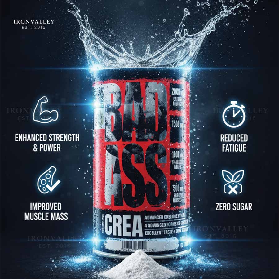 Push your limits with BAD ASS CREATINE, a powerful formula built for those who train hard and demand more. Each serving delivers approximately 5 g of a multi-form creatine blend, combining Creatine Monohydrate, Tri-Creatine Malate, Magnesium Creatine Chelate, and Creatine Hydrochloride — designed to maximize absorption, ATP regeneration, and performance output.