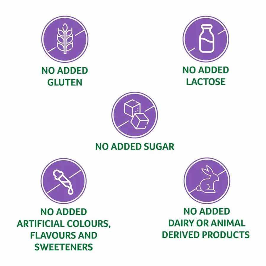 • No Added: Gluten, Lactose, Sugar, Artificial Colours, Artificial Flavours Or Sweeteners, Artificial Preservatives, Dairy Products Or Animal-derived Products.