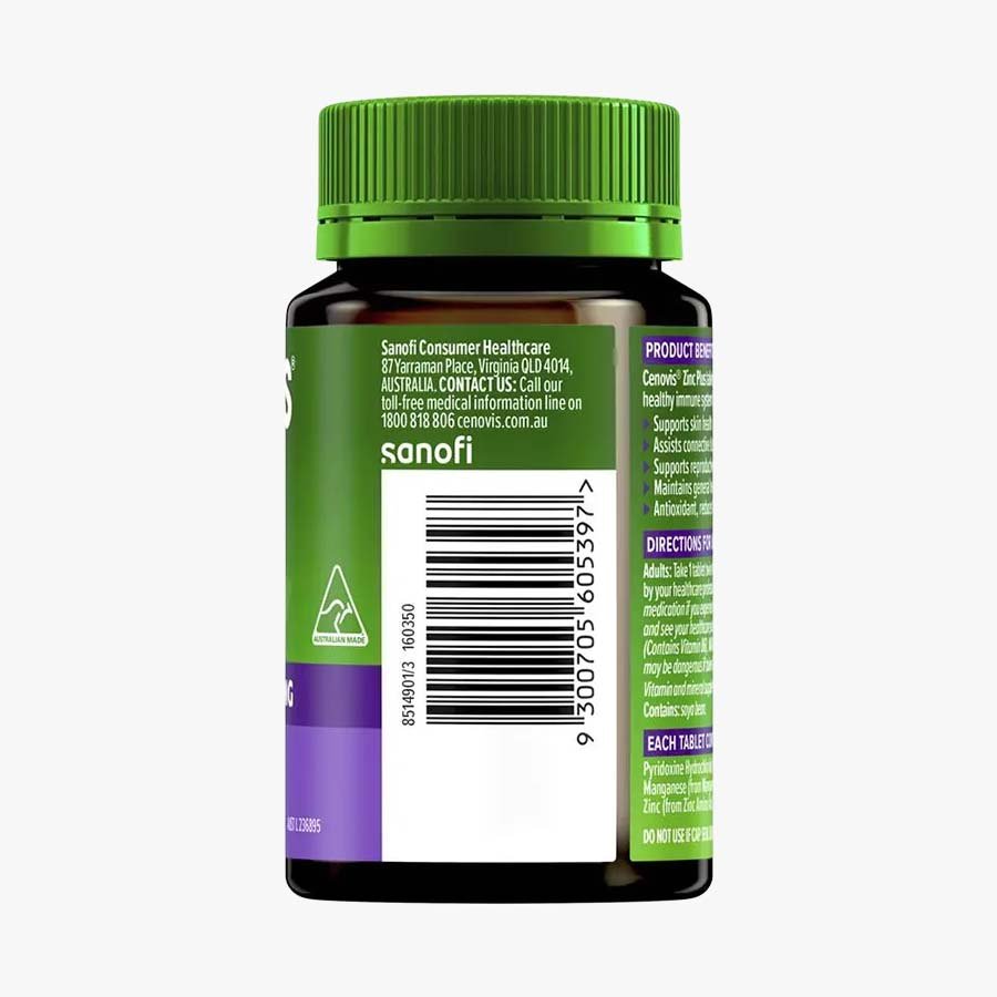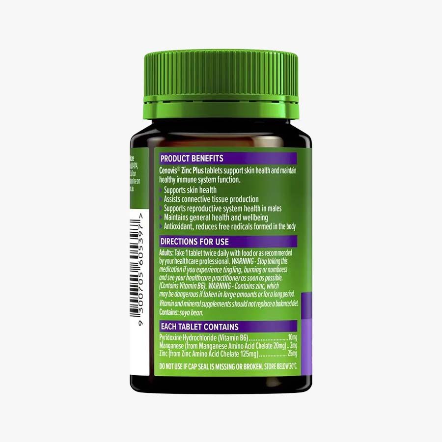 Cenovis Zinc Plus is a dietary supplement formulated to support immune system function, maintain healthy skin, and promote overall wellbeing. The formula combines Zinc, Vitamin B6, and Manganese to assist in connective tissue production, provide antioxidant protection, and support male reproductive health. Manufactured in Australia, this product contains no added gluten, lactose, sugar, dairy products, artificial colours, flavours, or preservatives.