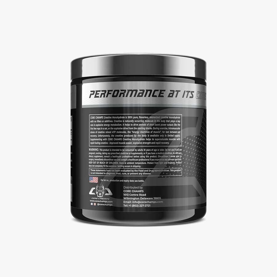 CORE CHAMPS Creatine Monohydrate is a 100% pure, flavorless, micronized creatine formula with no fillers or additives. Creatine occurs naturally in the body and plays a vital role in explosive energy production, supporting short bursts of power such as the first few reps of a set or explosive starts. During training, creatine helps replenish ATP, the muscle’s primary energy source, aiding faster recovery between sets. Since the body produces only limited amounts of creatine, supplementing with CORE CHAMPS Creatine Monohydrate helps saturate muscle stores, leading to greater power output, increased explosive strength, and quicker recovery.