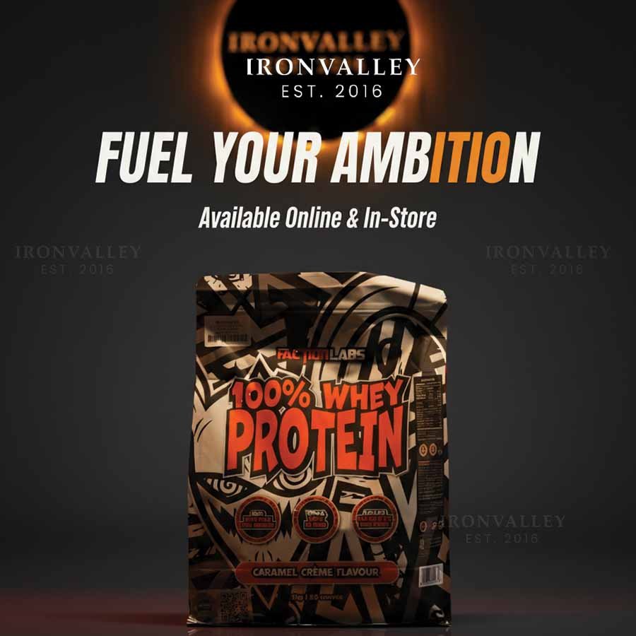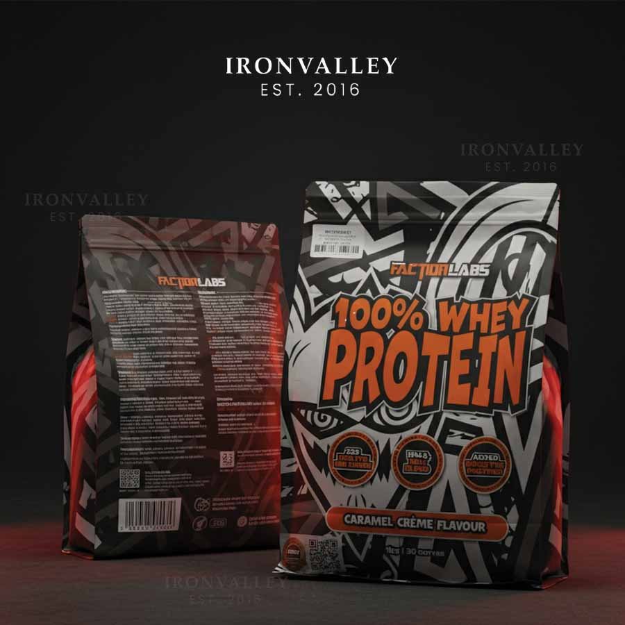 Faction Labs 100% Whey is a premium whey protein blend delivering 25 g of high-quality protein per serve from an advanced WPI/WPC formula, designed for recovery and lean muscle support in Caramel Crème and Chocolate Fudge flavours.