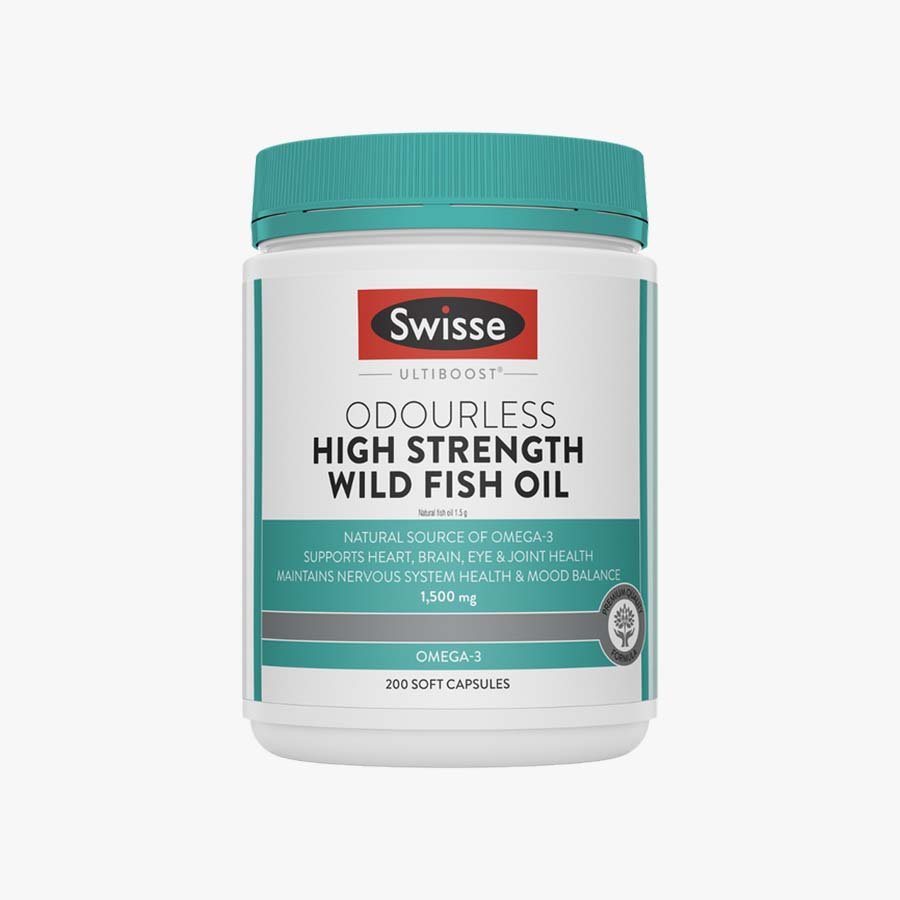 Swisse 1500 mg Odourless Wild Fish Oil delivers high-strength Omega-3 support with EPA and DHA to help maintain heart, brain, eye, and nervous system health. Sustainably sourced and odourless, it provides powerful daily support without any fishy aftertaste.