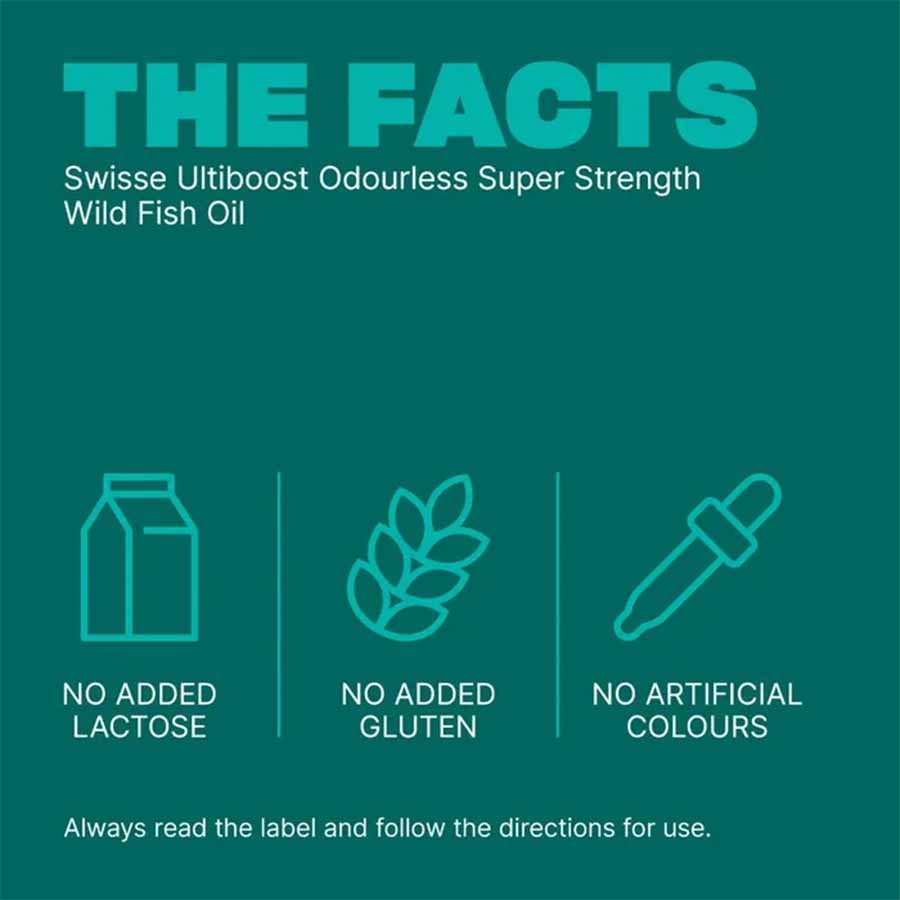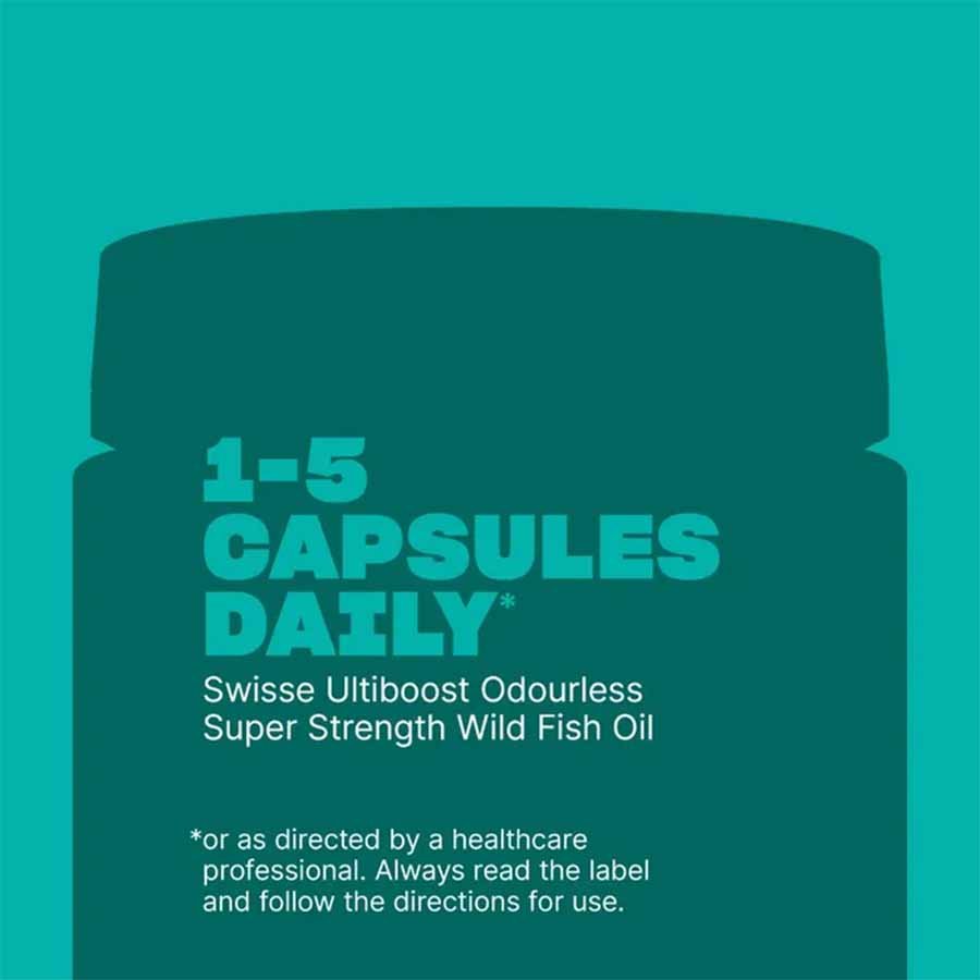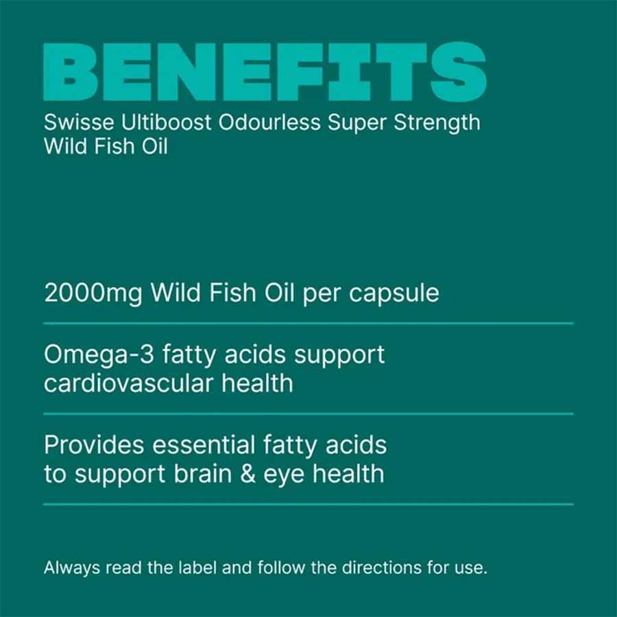 Swisse 2000 mg Odourless Wild Fish Oil delivers super-strength Omega-3 support with high levels of EPA and DHA to help maintain heart, brain, eye, and nervous system health. Sustainably sourced and odourless, it provides powerful daily support without any fishy aftertaste.
